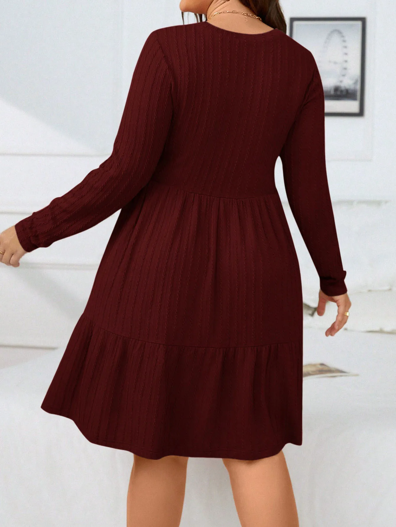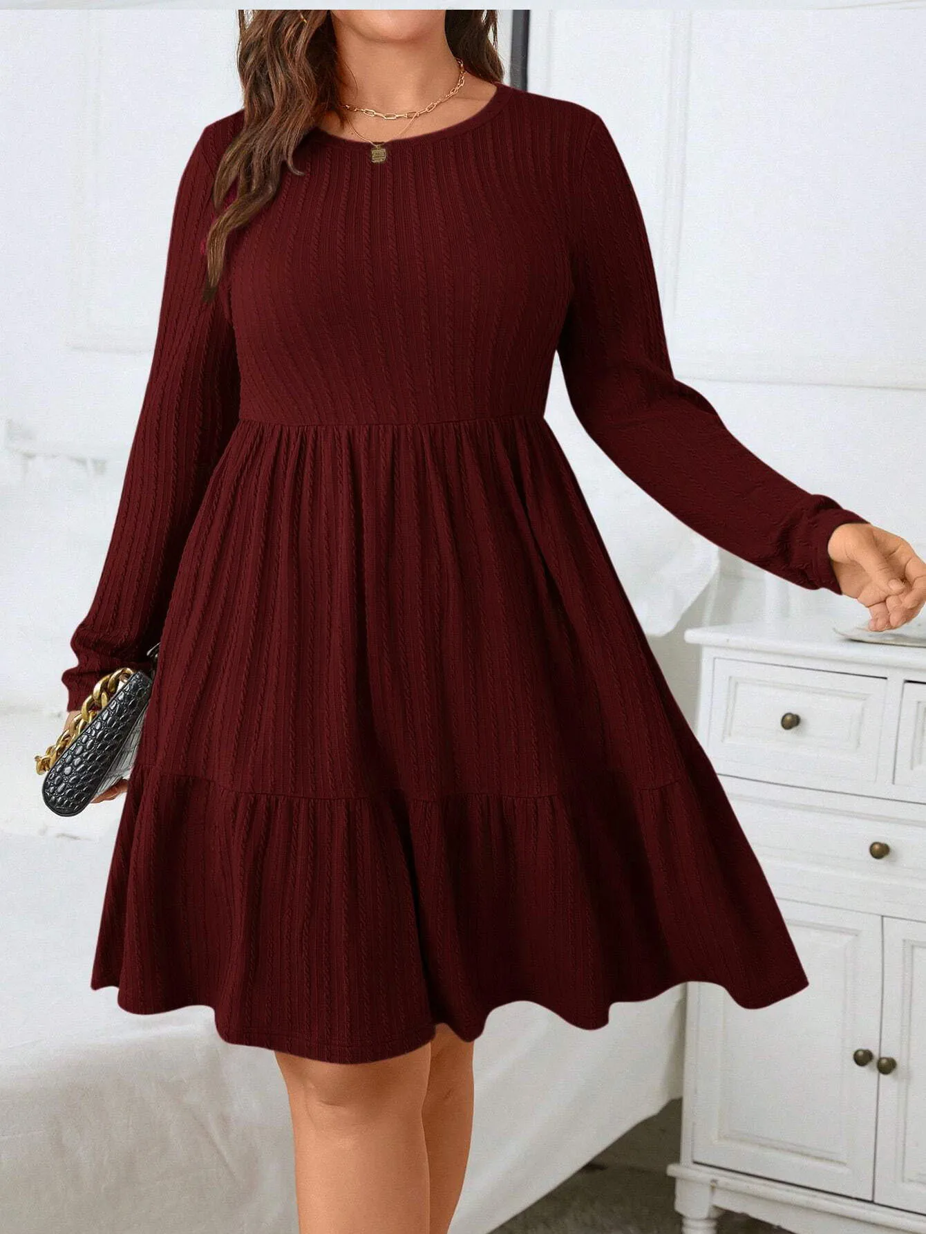 Wrap yourself in warmth and elegance with the CrimsonCozy Plus Size Knitted Sweater Dress—a winter wardrobe essential designed to flatter and inspire. Crafted in a rich wine red hue, this cozy yet sophisticated dress features a classic O-neck, long sleeves, and a beautifully pleated skirt for a touch of effortless charm.